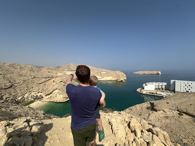 Our itinerary was relatively simple: coast, desert, then back to coast. We arrived in the capital and largest city, Muscat, and drove our car East to a resort nestled into the jagged hills of the coast. All around us we saw signs of the economic influence of other nations. Our first resort was a Chinese luxury brand, filled with Indian, European, & Russian families. When we interacted with anyone and they realized we were from the U.S. they were typically surprised, saying things like, "That's a long way to travel for vacation." As we drove, we passed a large billboard thanking the Trump Administration for it's investment in a highway infrastructure project.