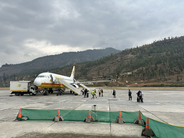 The airport in Paro is the only international airport in a country with a land area nearly equal to that of Switzerland. You deplane on the tarmac, but despite this, it's incredibly quiet. Only a handful of flights arrive and depart from the international hub each day. After so much time spent in clamor India, the silence that followed when the plane cut its engines was forceful.